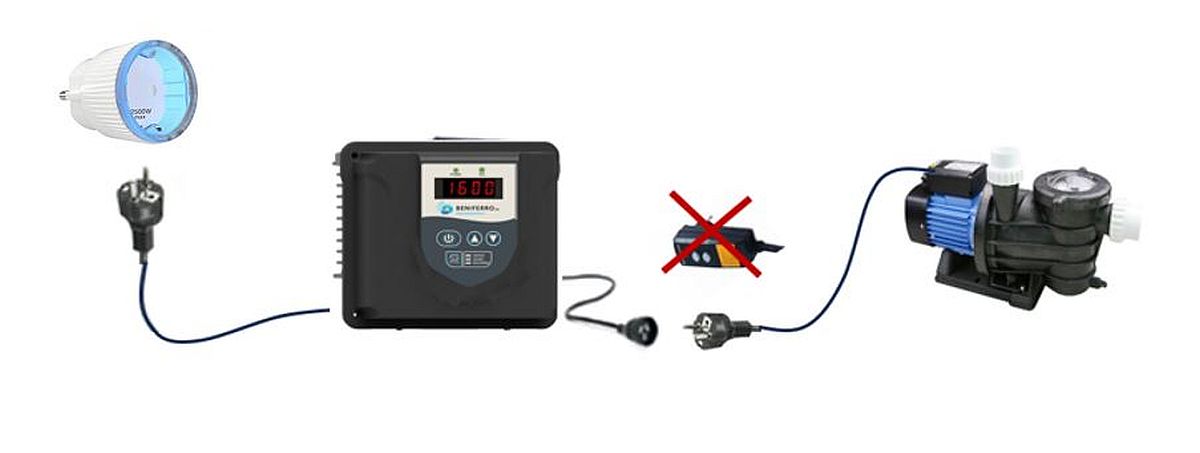 den Frequenzregler in den Wifipool-Stecker und die Filterpumpe in den Stecker des Frequenzumrichters.