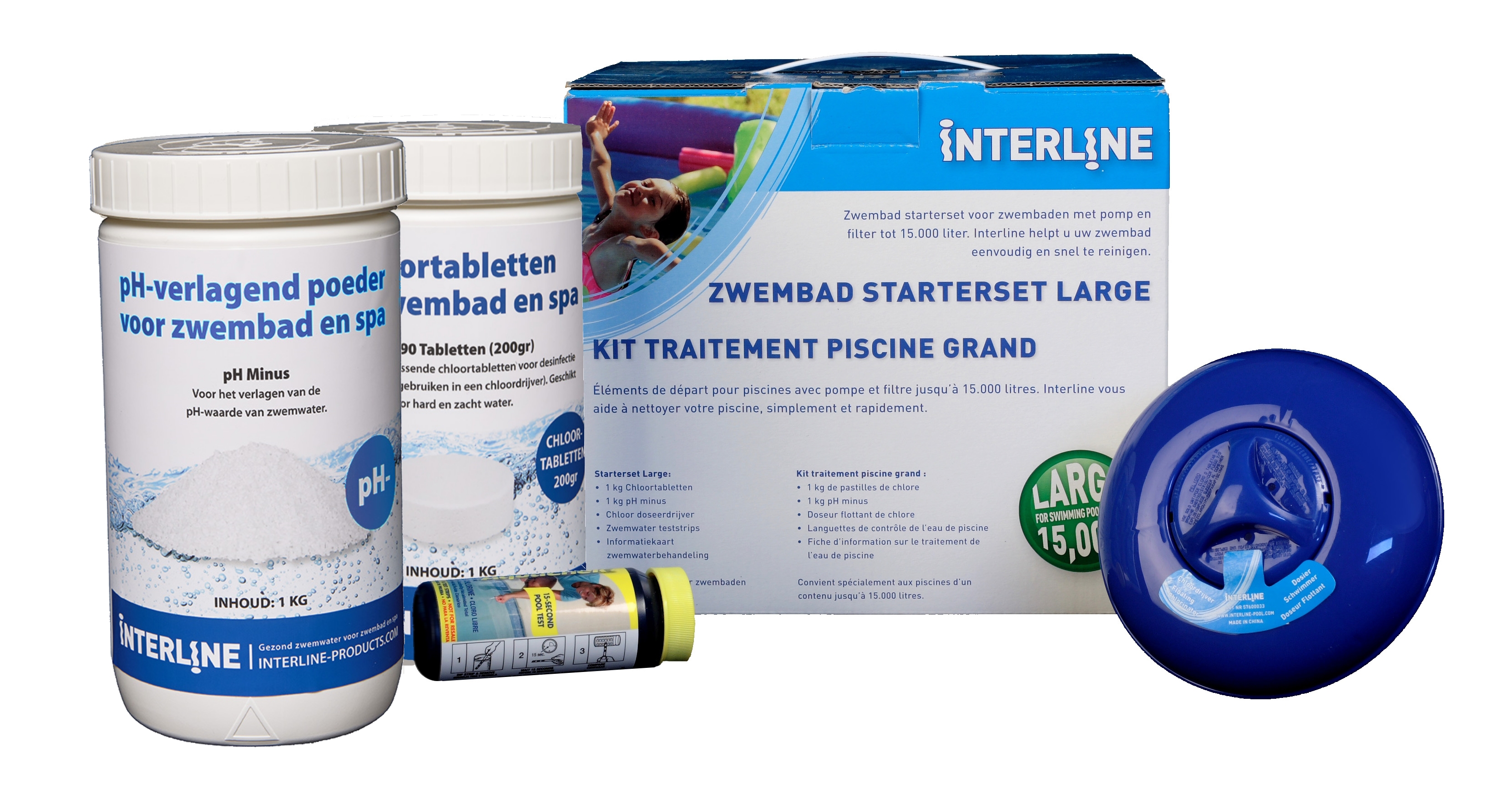 Das Interline Schwimmbad-Starterset ist ein Basispaket, das Chemikalien und Zubehör enthält, um Ihr Schwimmbadwasser zu