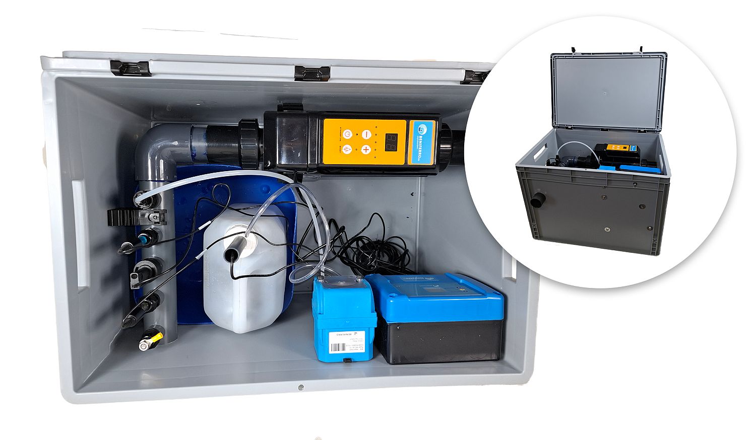 Diese Salzelektrolyseanlage kommt vormontiert in einer 40 x 60 x 45 cm großen Box.