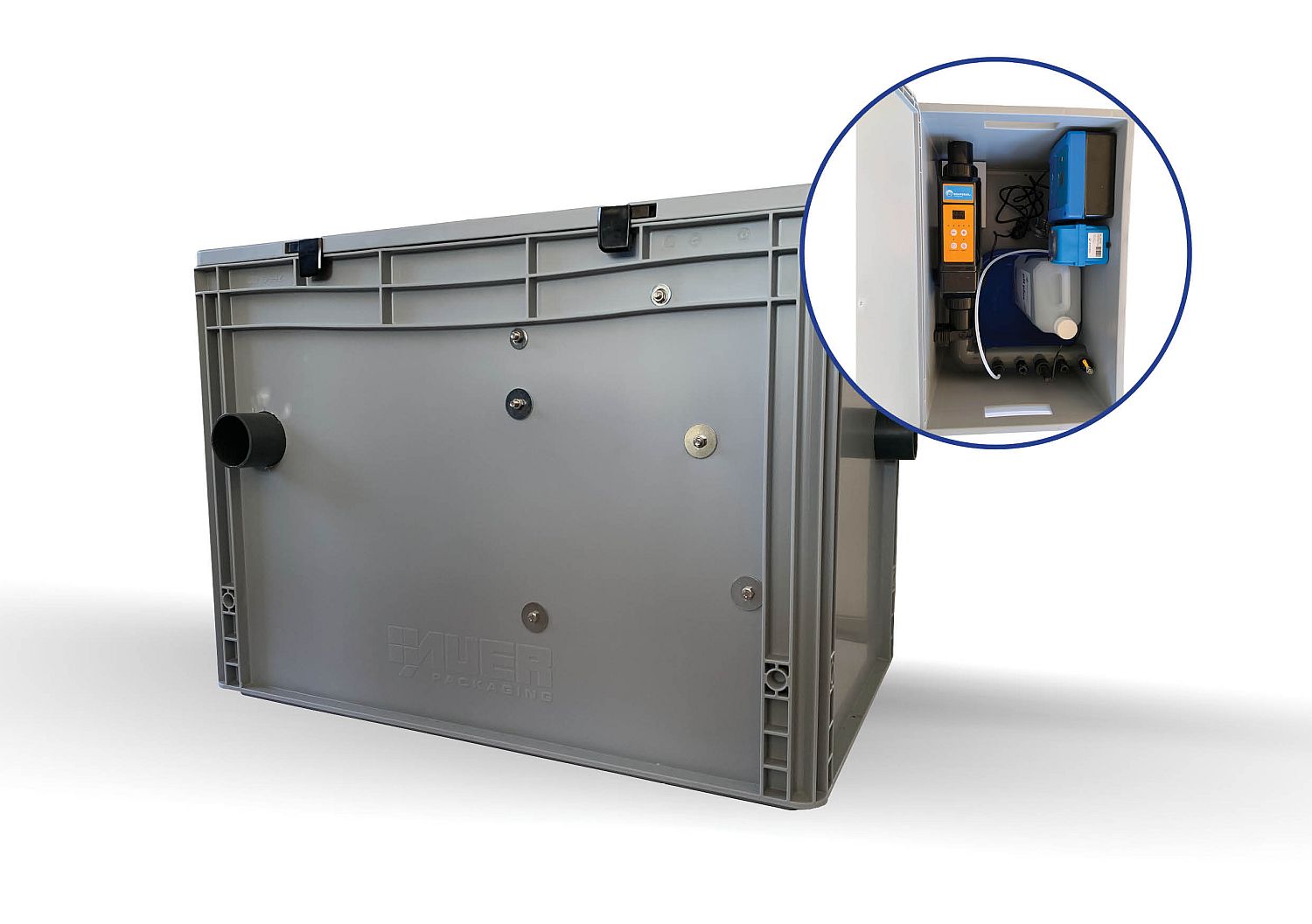 Die Box enthält eine Aufnahme für einen 10-Liter-pH-Behälter (nicht im Lieferumfang enthalten)