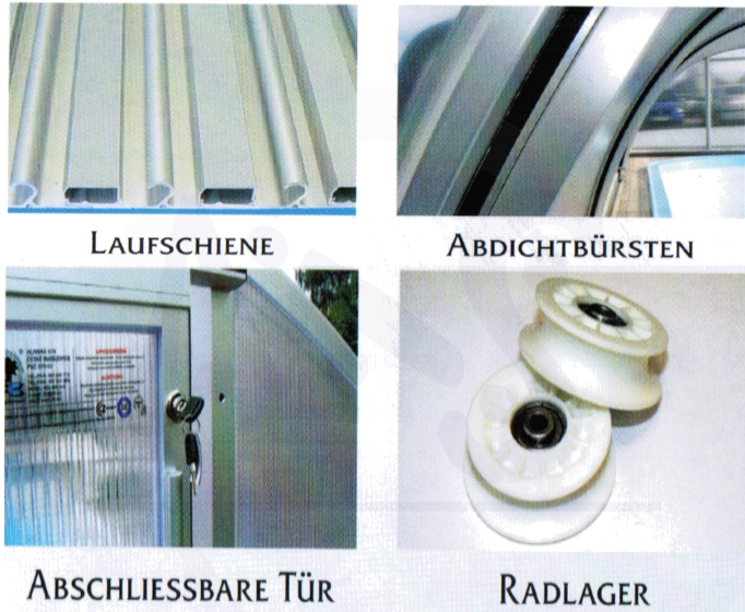 und Laufschienen in der Länge der Überdachung, hergestellt aus Aluminium.