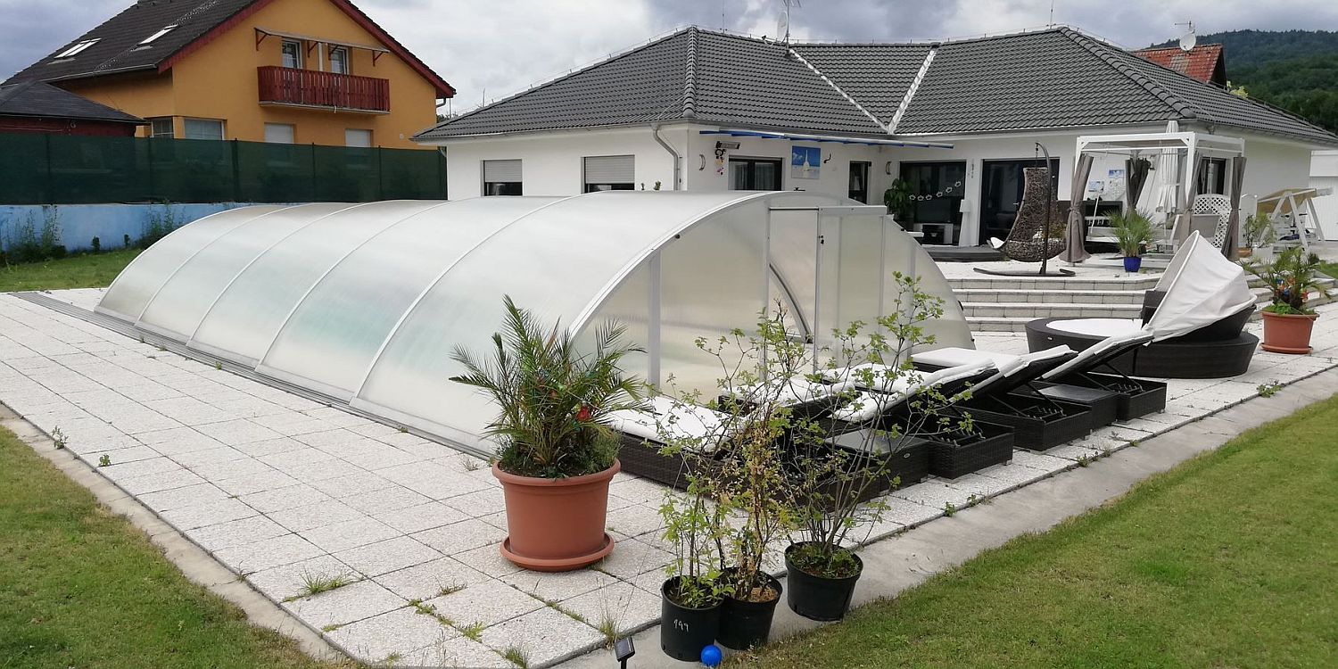 Unsere Schwimmbadüberdachung Marlos ist preislich eine der