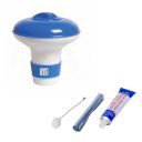 Schwimmdosierer mit Thermometer Schwimmdosierer für Wasserpflege, mit verschließbarem Deckel zum gezielten Einsatz der Chlor- und Multifunktionstabletten 200 g und 250 g. Die Dosierung ist regulierbar, mit Verstellring. Für 1 kg Tabletten