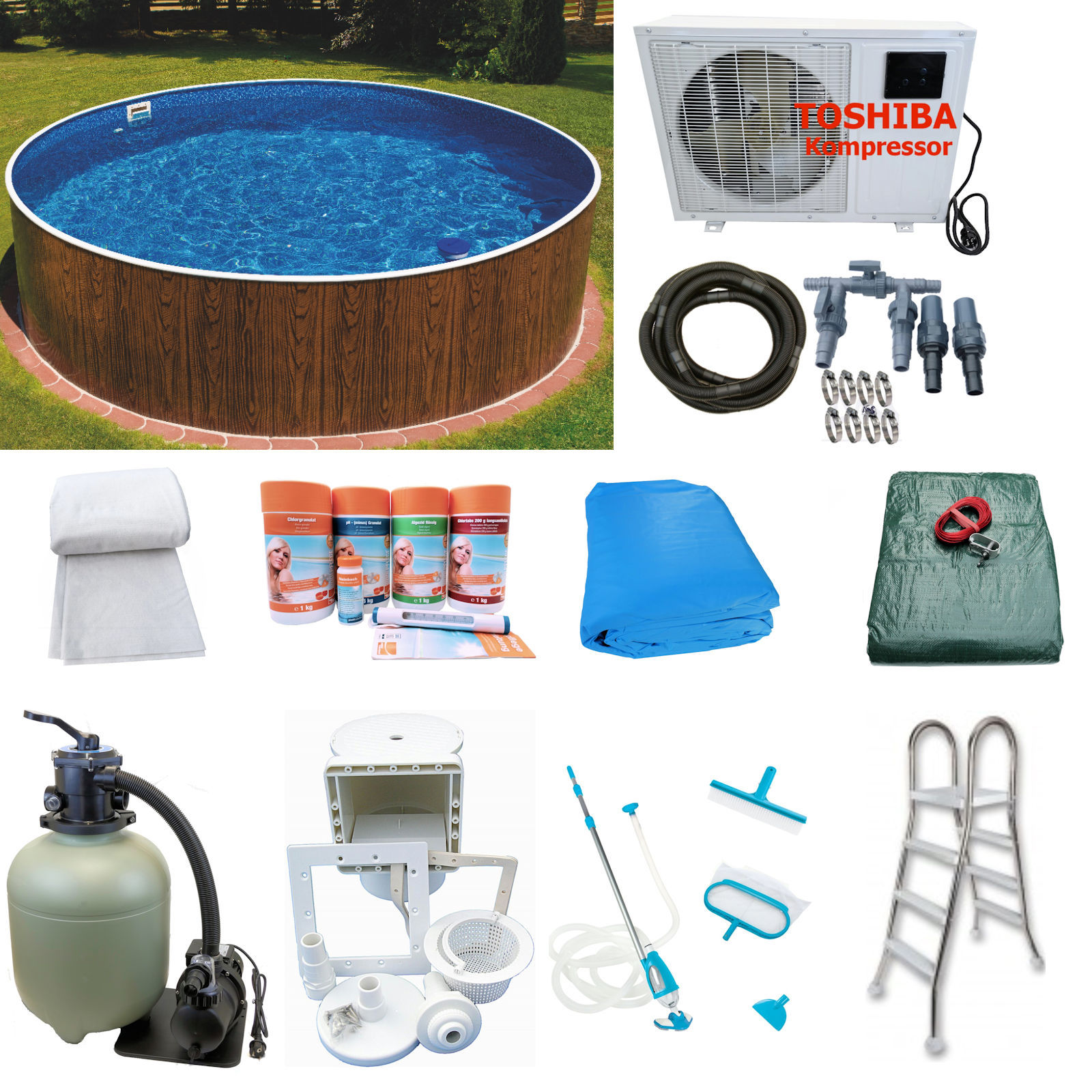 Rundpool-PROFI-KOMPLETT-Set Holzoptik 3,60 x 1,20 m Wir bieten Ihnen hier ein Rundum-Sorglos-Paket, mit Sandfilteranlage, Skimmer, Innenfolie, Vlies, Abdeckplane,Pflegeset, Reinigungsset und Wärmepumpe Dieser optisch naturalistische Pool rundet harmonisch das Gesamtbild Ihres Gartens ab.