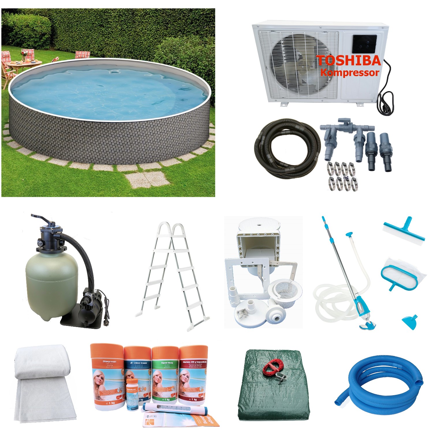 Rundpool-PROFI-KOMPLETT-Set in Rattanoptik 3,60 x 1,20 m Wir bieten Ihnen hier ein Rundum-Sorglos-Paket, mit Sandfilteranlage, Skimmer, Innenfolie, Vlies, Abdeckplane,Pflegeset, Reinigungsset und Wärmepumpe Mit diesem optisch eleganten Pool in Rattanoptikwird Ihr Garten der schönste der gesamten Nachbarschaft sein.